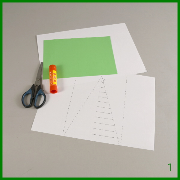 1. co budete k výrobě stromku potřebovat - barevný papír A5, vytištěný vzor stromku, tvrdý papír A4, nůžky, lepidlo