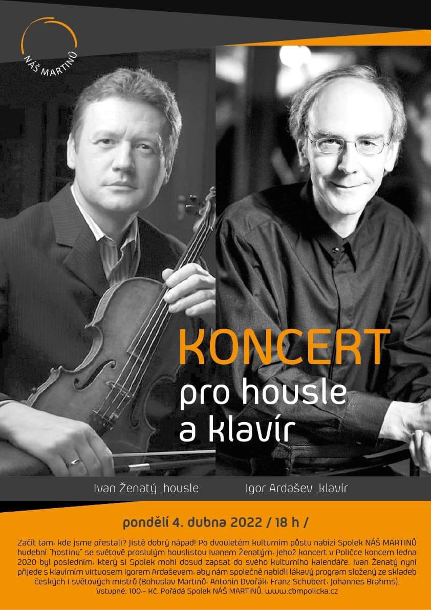 Po dvouletém kulturním půstu nabízí Spolek NÁŠ MARTINŮ hudební "hostinu" se světově proslulým houslistou Ivanem Ženatým, jehož koncert v Poličce koncem ledna 2020 byl posledním, který si Spolek mohl dosud zapsat do svého kulturního kalendáře. Ivan Ženatý nyní přijede s klavírním virtuosem Igorem Ardaševem, aby nám společně nabídli lákavý program složený ze skladeb českých i světových mistrů (Bohuslav Martinů, Antonín Dvořák, Franz Schubert, Johannes Brahms).